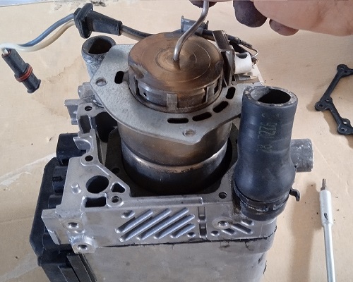 4- Dévissez les quatre vis de la pompe de circulation, enlevez la cloche inférieur pour accéder à la turbine.